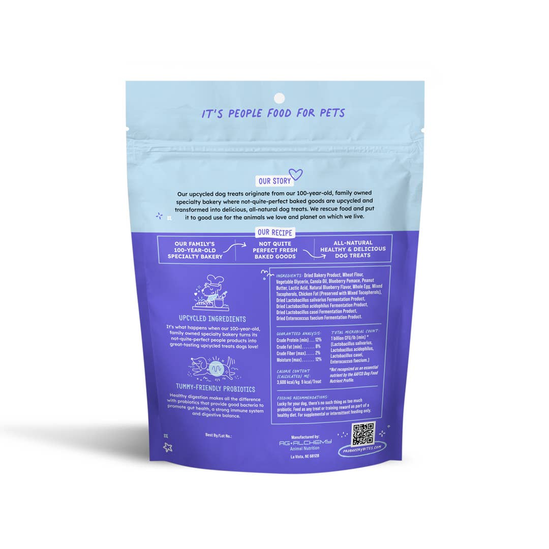 Ingredients: Dried Bakery Product, Wheat Flour, Vegetable Glycerin, Canola Oil, Blueberry Pomace, Peanut Butter, Lactic Acid, Brown Rice, Natural Blueberry Flavor, Whole Egg, Mixed Tocopherols, Rosemary Extract, Chicken Fat (Preserved with Mixed Tocopherols), Lactobacillus salvarius Fermentation, Lactobacillus acidophilus Fermentation, Lactobacillus casei Fermentation, Enterococcus faecium Fermentation.
